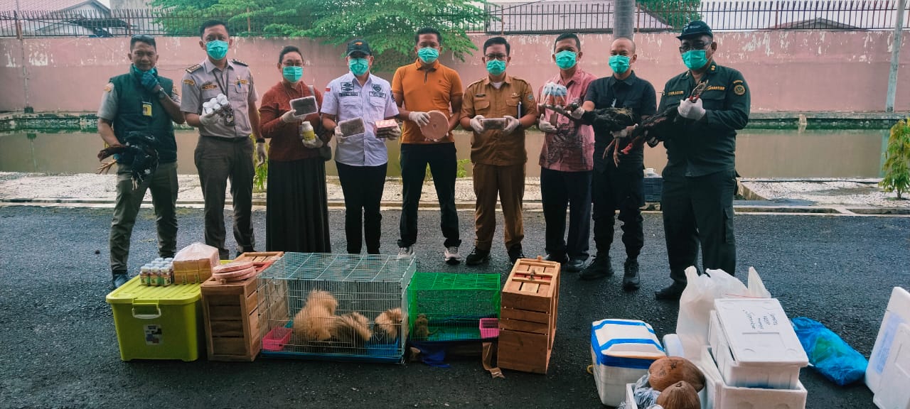 Media Pembawa ilegal tersebut terdiri dari 60 ekor ayam, 2 ekor hewan pengerat meerkat, 3 ekor hewan mamalia sigung, 12 ekor hewan laut kelomang serta 3 kotak suplemen dan perlengkapan ayam, ikan asin sebanyak 5 kg dan buah kelapa 2 buah.